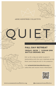 We want to meet you in the quiet. If you’re local to the Clark County or PDX area, join us on Friday, September 26th to grow in relationship with Christ, spend time in His Word, seek His will, and be still in His presence.
